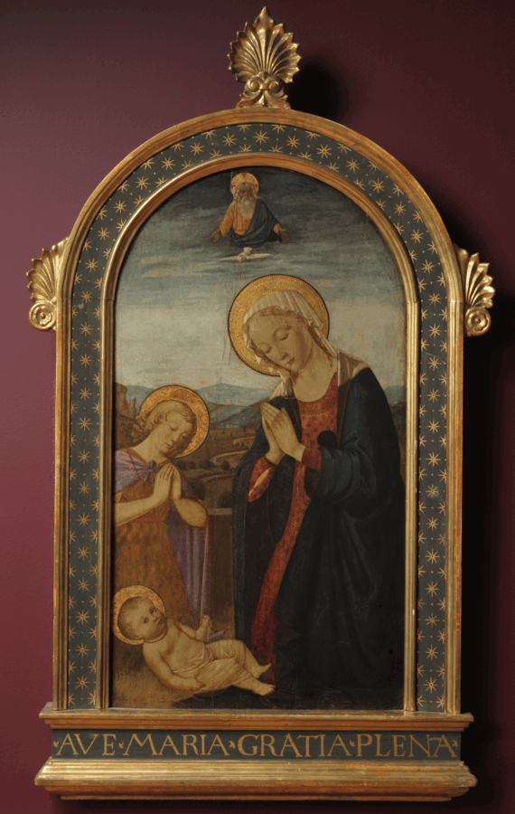 L'auteur de cette œuvre est le Maître de la Nativité Johnson, identifié comme étant Domenico di Zanobi (actif à Florence, fin du XVe s. – début du XVIe s.). Typique de la production de cet artiste, le visage de la Vierge traduit un recueillement habituel dans les œuvres du maître, et cette sereine douceur qui souligne, par sa délicatesse, la grande qualité du panneau d'Angers. Il se distingue en effet du corpus des œuvres de l'artiste, qui a réinterprété à de nombreuses reprises cette composition prisée des commanditaires florentins de l'époque. La composition, que l'artiste modifie d'un panneau à l'autre, comporte ici quatre personnages, la Vierge et l'Enfant, entourés de saint Jean-Baptiste en prière, et surmontés d'une figure du Père et de la colombe du Saint-Esprit. Des analyses ont permis de constater qu'une cinquième figure, sans doute évacuée à un stade précoce de la réalisation de l'œuvre, avait été placée, à l'origine, entre l'Enfant et saint Jean-Baptiste.