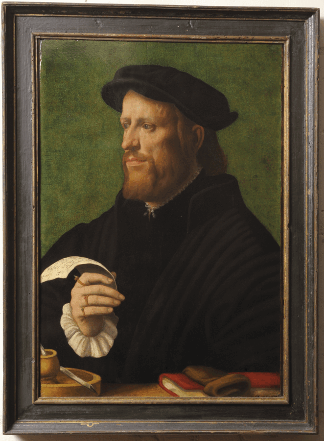 L'attribution de ce portrait d'homme reste problématique. Considéré par la récupération artistique comme une œuvre de Vincenzo Catena (vers 1470 – Venise, 1531), un peintre vénitien dont la carrière est à cheval sur la fin du XVe siècle et le début du suivant, il a ensuite été attribué tour à tour aux écoles vénitienne, hollandaise, allemande et anglaise. Des recherches sont en cours pour préciser, sinon l'auteur de l'œuvre, du moins l'aire géographique de sa provenance.